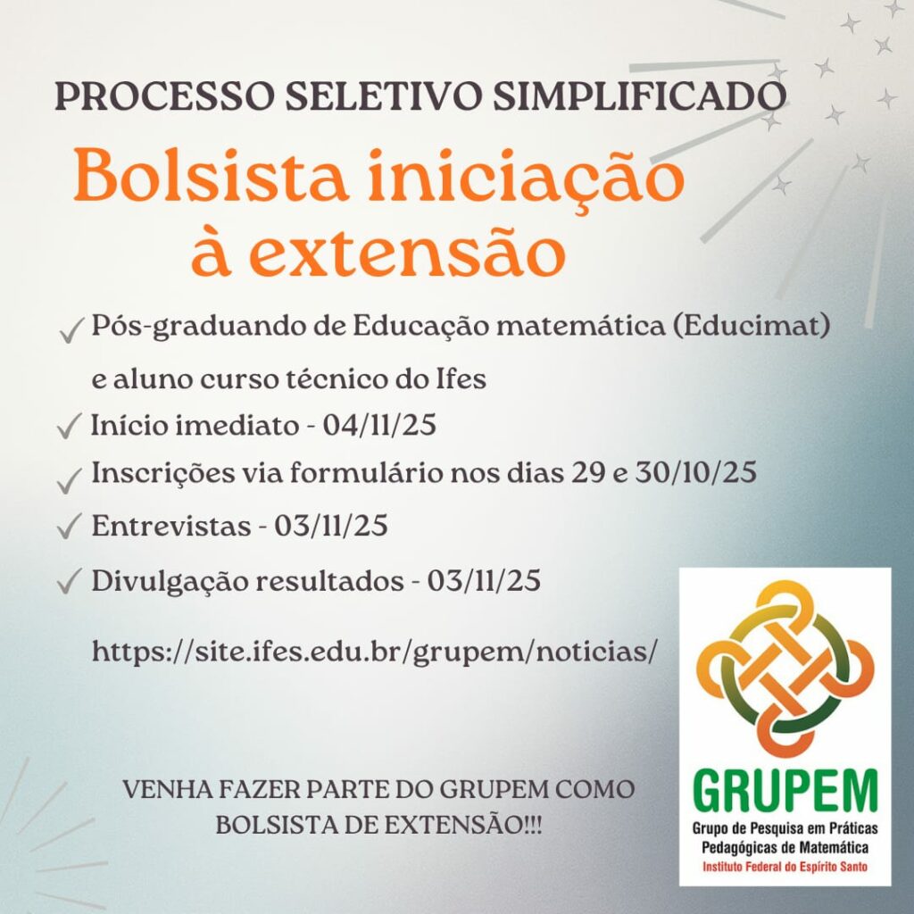 Maiores informações podem ser obtidas no edital por meio do link a seguir: https://proex.ifes.edu.br/images/stories/Chamada-interna-2022/Chamada-interna-2025/Minuta_Edital_Paex_bolsas_2025_vfinal.pdf